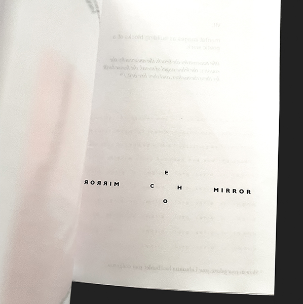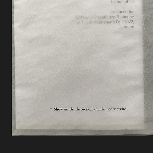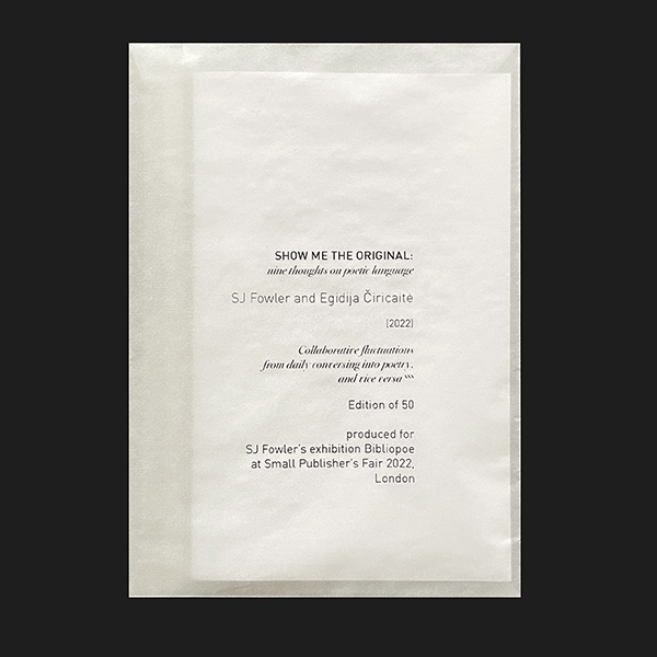 SHOW ME THE ORIGINAL: nine thoughts on poetic language (2022) SHOW ME THE ORIGINAL: nine thoughts on poetic language is a collaboration with SJ Fowler for his Bibliopoe exhibition at Small Publishers Fair, 2022. Set between theory, poetry and image, the book explores the notion of "original" in poetic language.